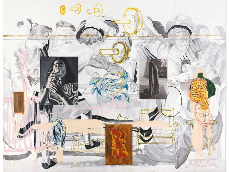 Dean Martin in Some Came Running (1990–1991) by David Salle is a large postmodern painting in oil and acrylic that exemplifies his characteristic layering of disparate imagery and cinematic juxtapositions, executed with three inset panels on the canvas. The work’s title references the 1958 film Some Came Running starring Dean Martin, while the painting itself combines historical tapestry motifs, modern figures, and fragmented visual elements to create a complex, non-narrative visual “chorus” typical of Salle’s style